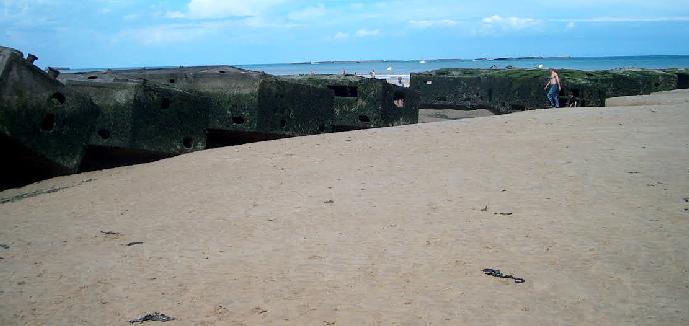 This is part of the artificial harbors still there after 60 years called Mullberrys. The 50th Northumbrian Division landed on Gold Beach. Their primary directive was to take control of the small port of Arromanches. This was to be a site of one of the (two) Mulberrys - artificial harbors for bringing supplies on land
